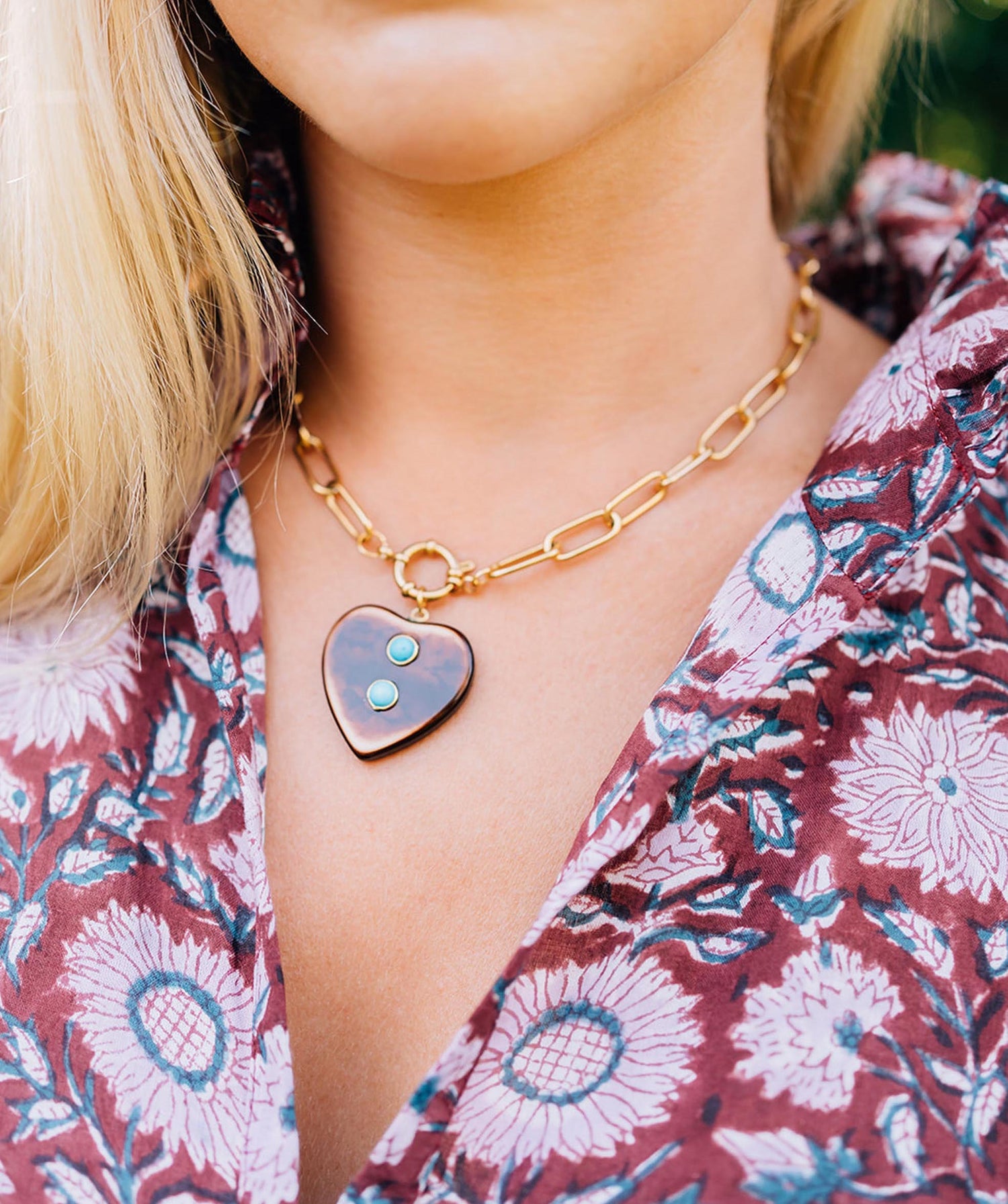 Now this is a necklace to love. Chunky yet dainty, our Coco Tortoise Heart Necklace features genuine turquoise and an of-the-moment oversized chain that works with sweaters and dresses alike.