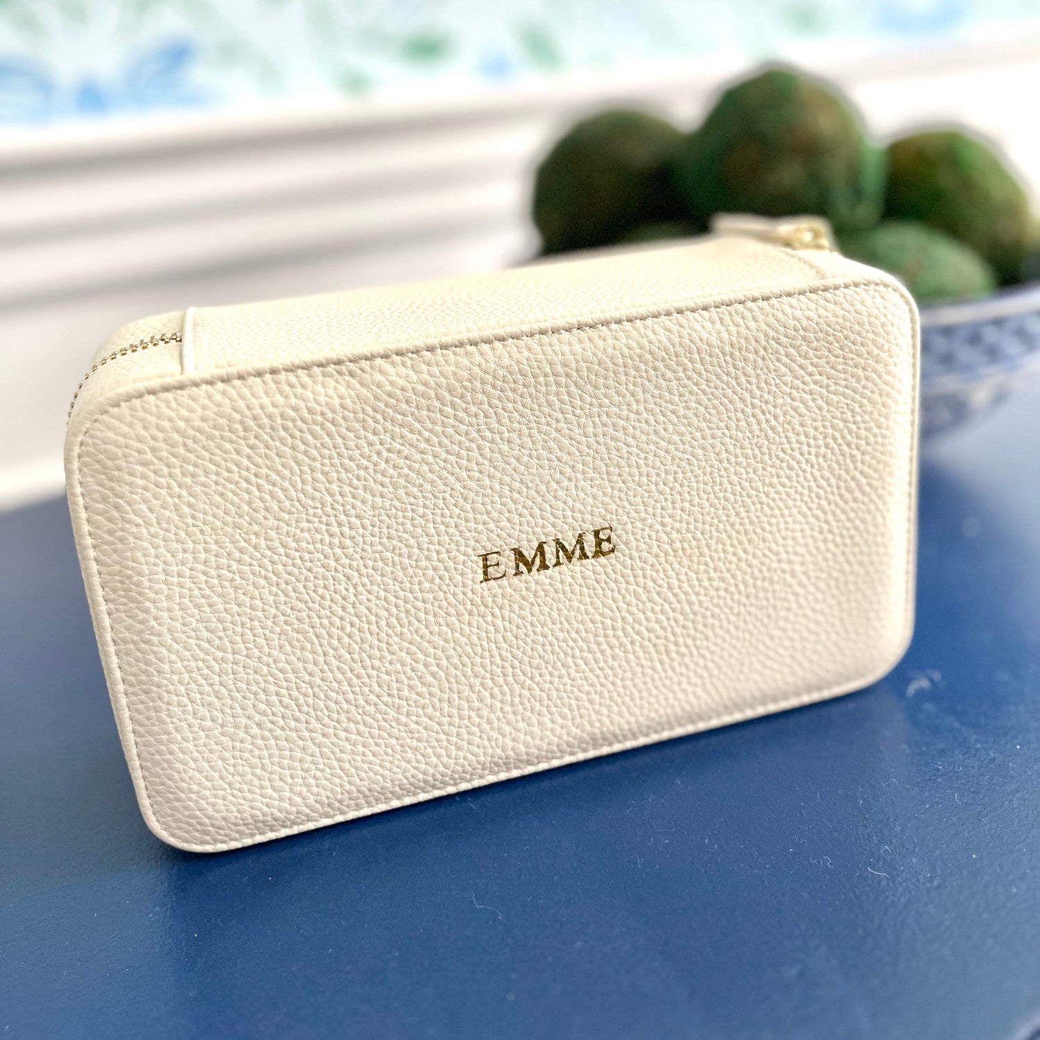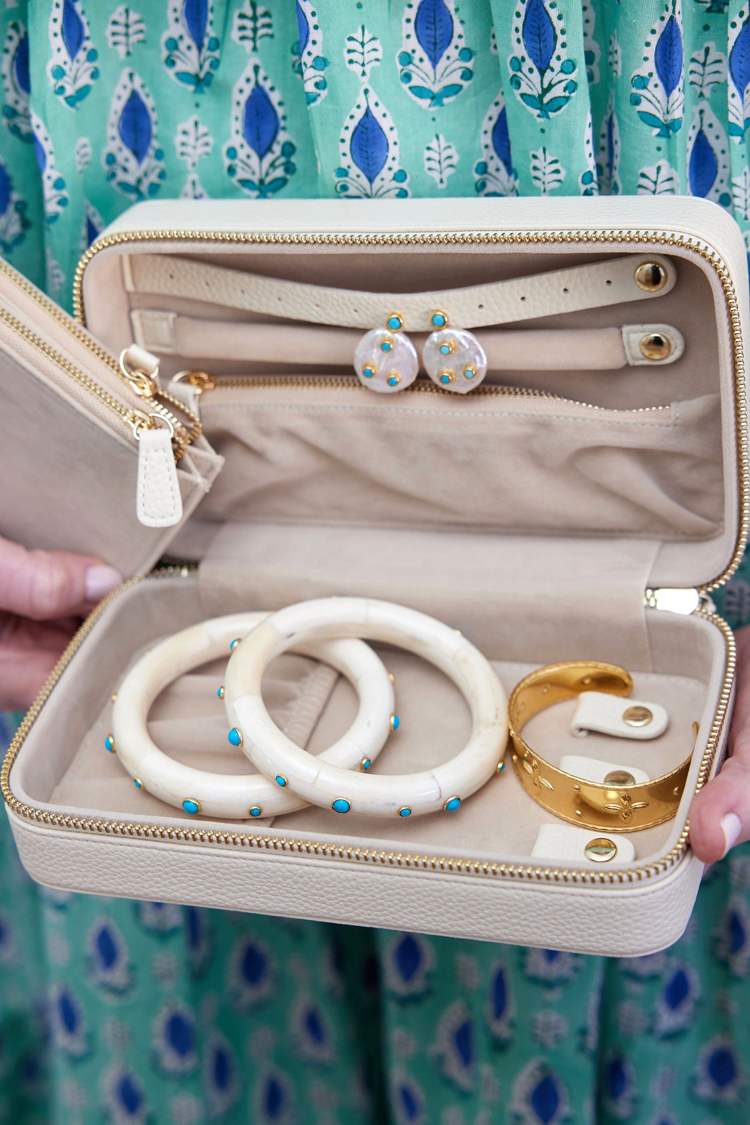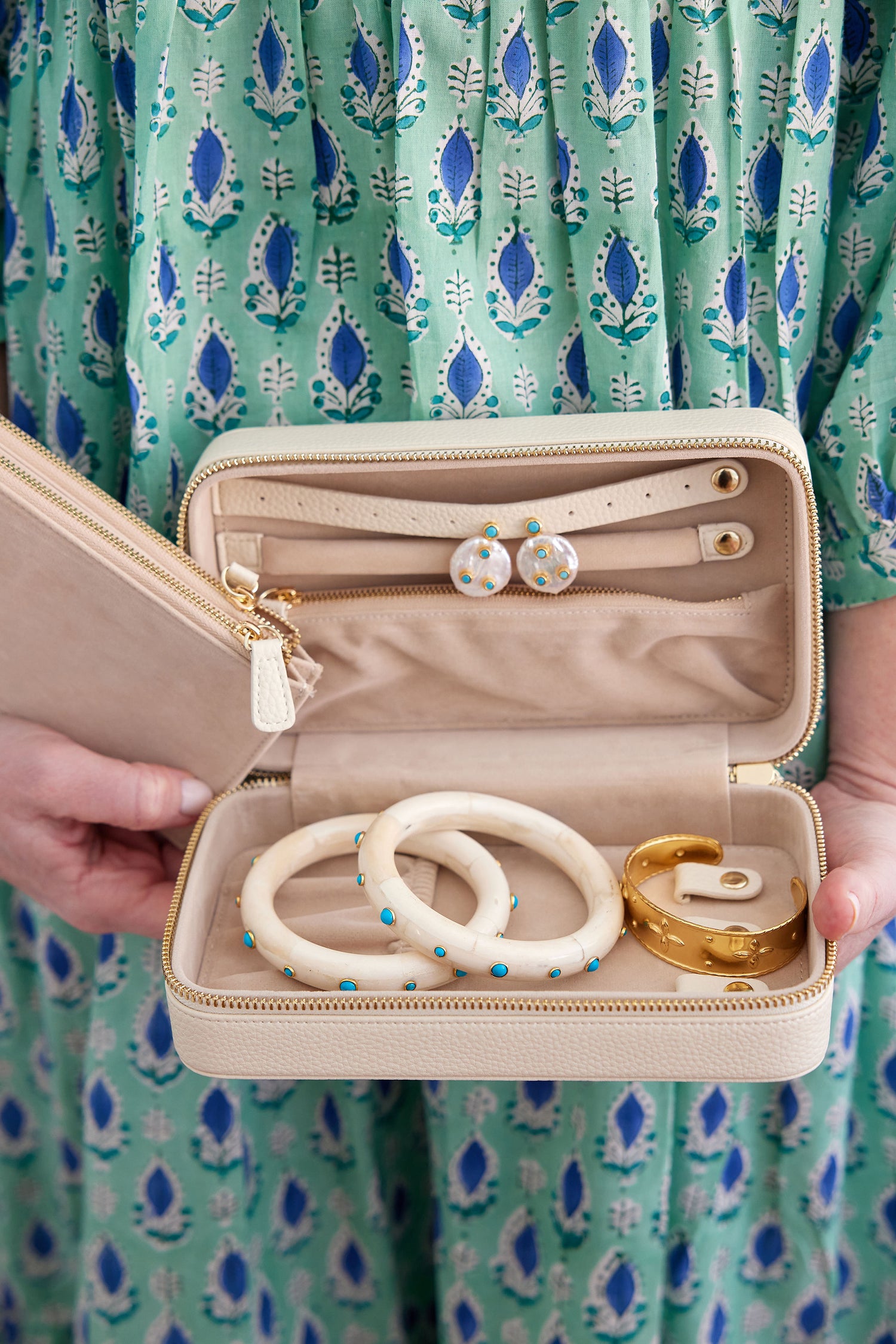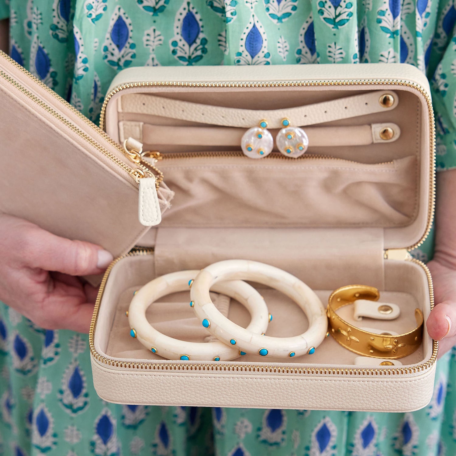 The perfect gift for the gal on the go. With dedicated storage for rings and earrings, two removable zipper pouches, plus complimentary gold-embossed personalization, our Jumbo Travel Jewelry Case is a classic addition to anyone's travel kit.