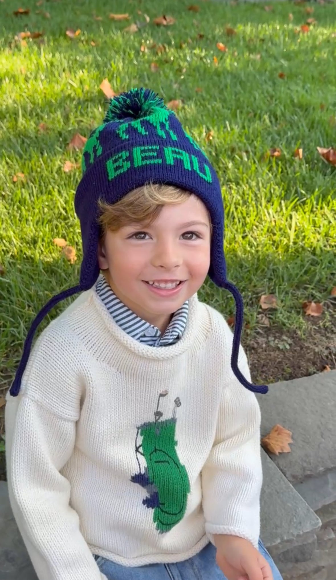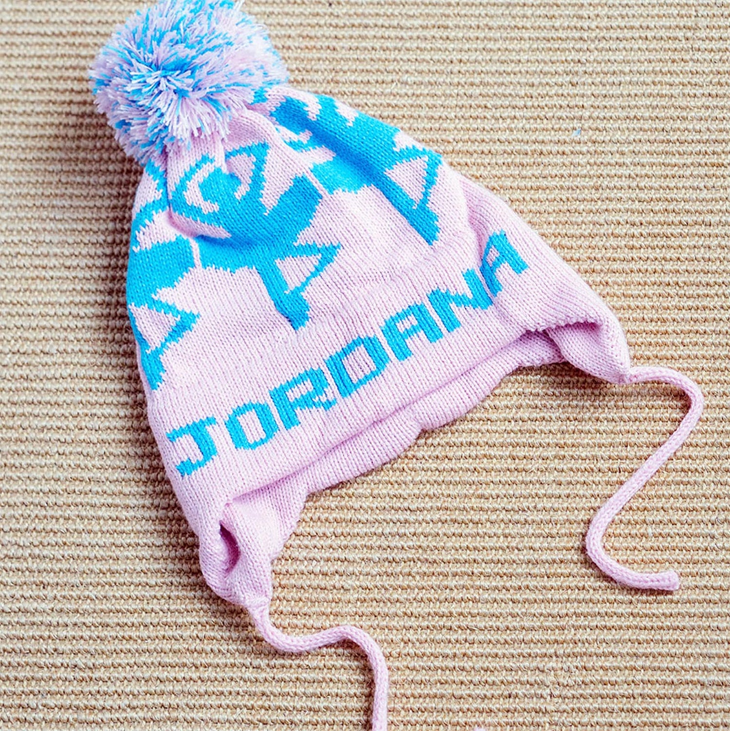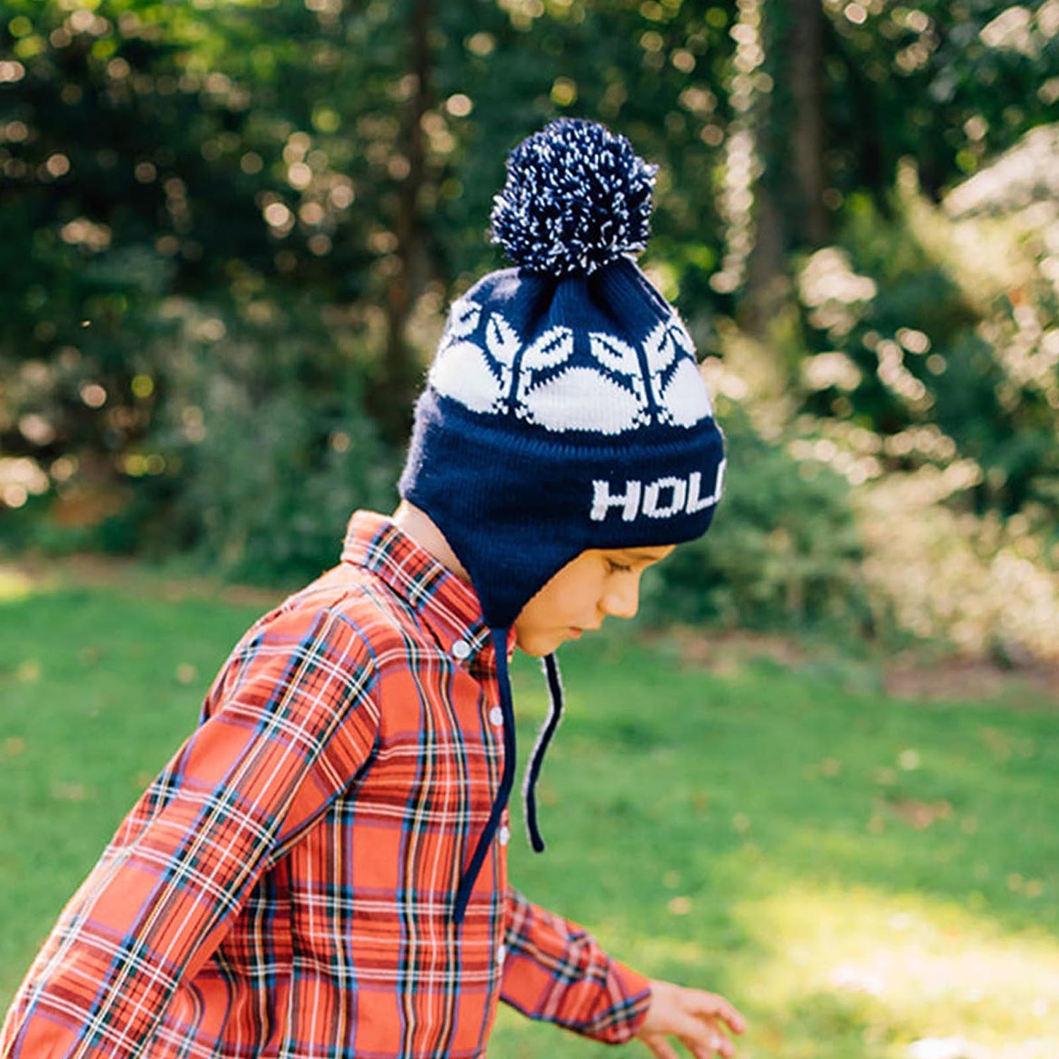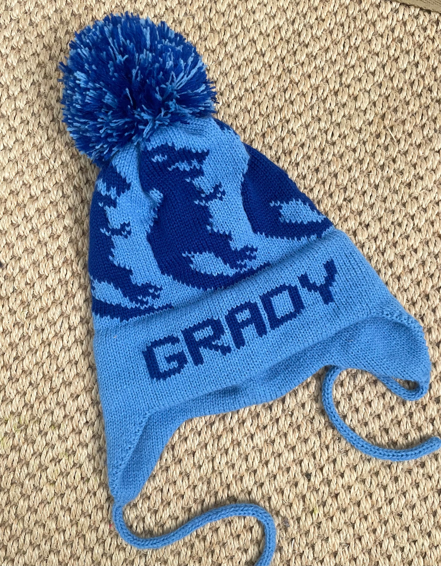 - Ear flaps with ties; pom pom detail
